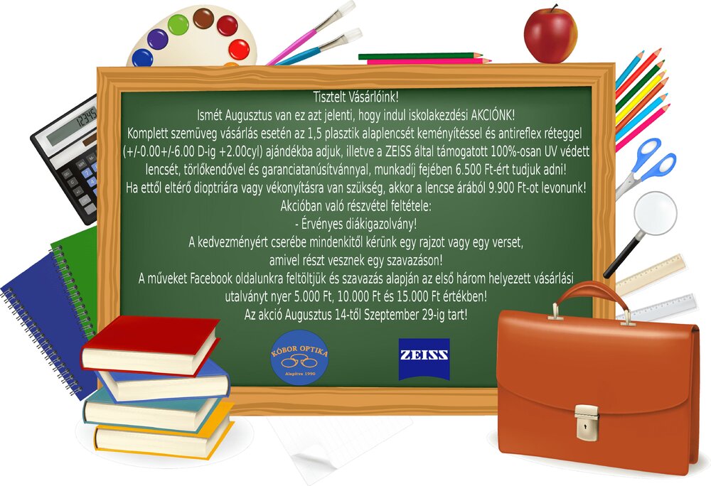 Amennyiben az iskolakezdési akcióra gondol, akkor a diákok az 1,5 HMC (antireflex és kemény réteg) Zeiss márkázatlan lencsét ajándékba kapják vagy, ha 1,5 HMC Zeiss márkázott lencsét választanak akkor 2500 Ft-ot kell fizetni.Ha a diákok rajzzal vagy verssel kedveskednek akkor a munkadíjat is elengedjük aminek értéke 2500 Ft.