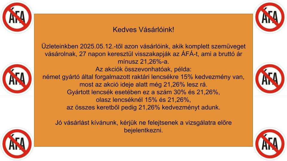 Üzleteinkben 2025.05.12.-től azon vásárlóink, akik komplett szemüveget vásárolnak, 27 napon keresztül visszakapják az ÁFÁ-t, ami a bruttó ár mínusz 21,26%-a.