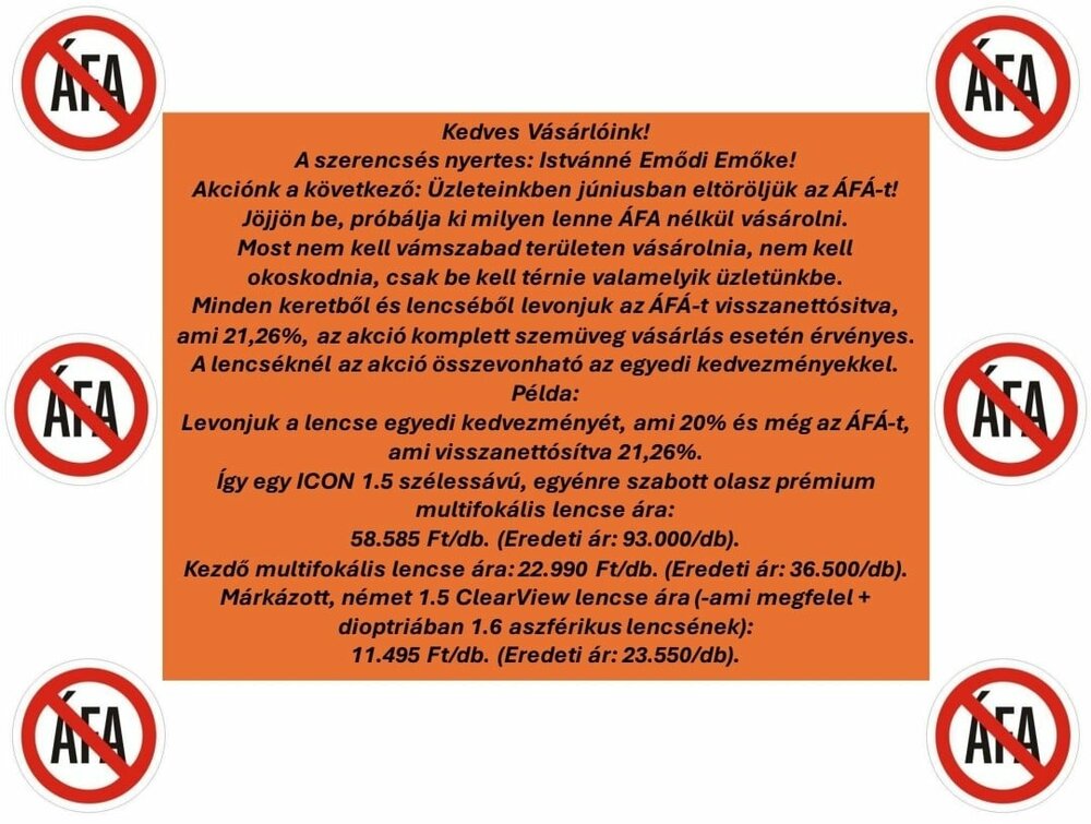 Üzleteinkben 2025.05.12.-től azon vásárlóink, akik komplett szemüveget vásárolnak, 27 napon keresztül visszakapják az ÁFÁ-t, ami a bruttó ár mínusz 21,26%-a.