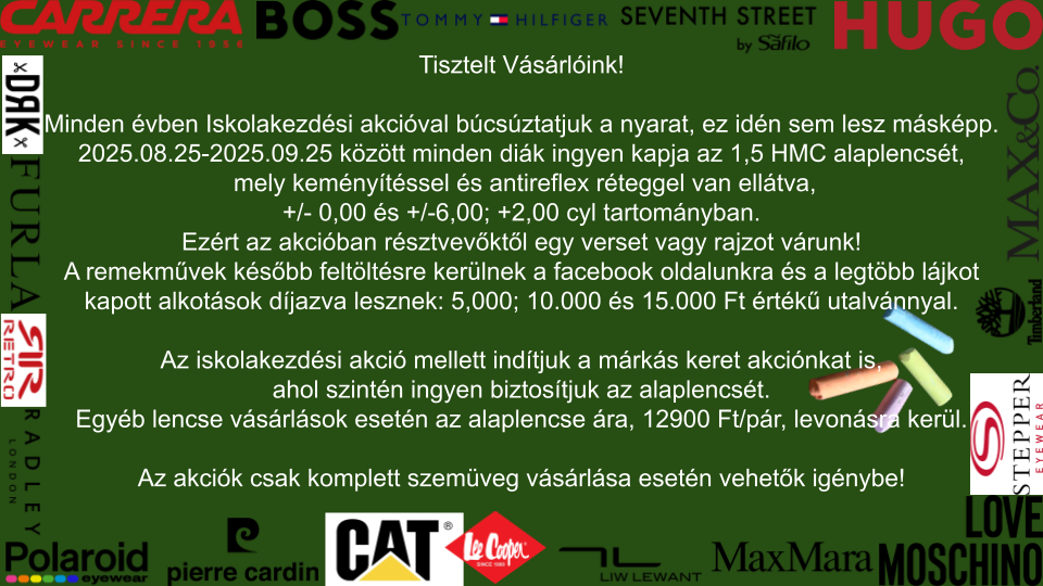 2025.08.25-2025.09.25 között minden diák ingyen kapja az 1,5 HMC alaplencsét, mely keményítéssel és antireflex réteggel van ellátva,
